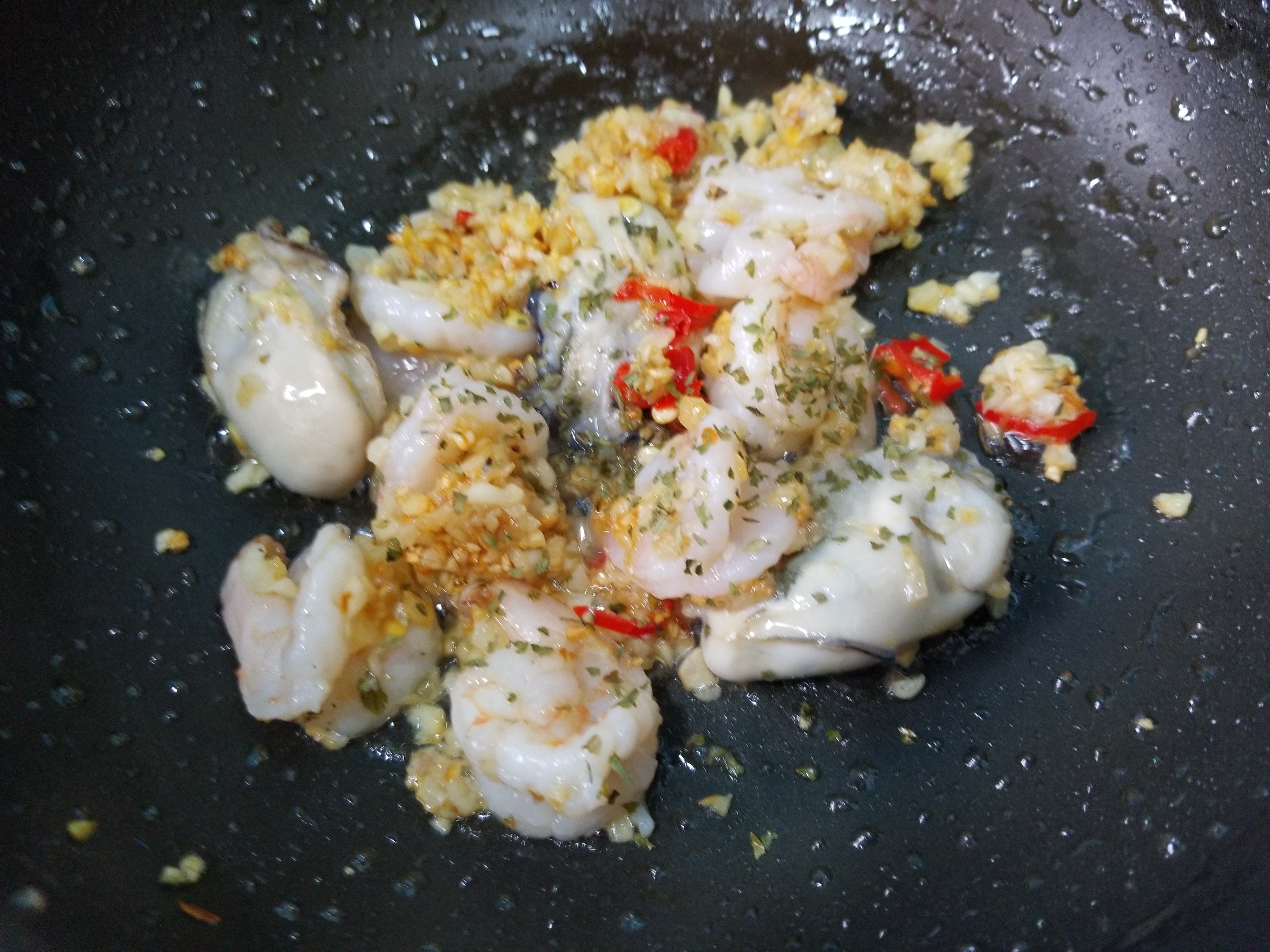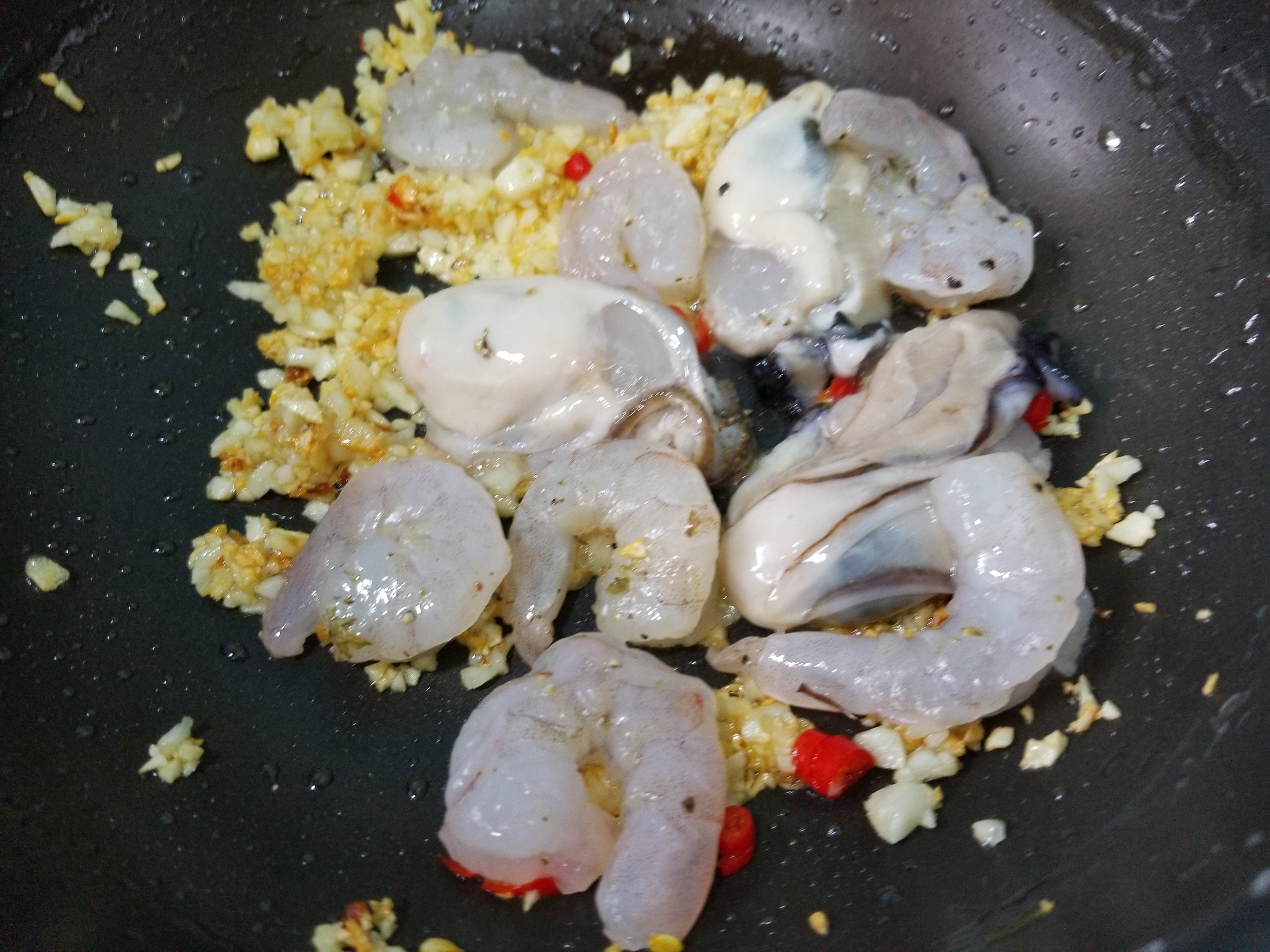 5. Furthermore, turn to medium heat, add oysters and shrimps. Keep frying until 80% cooked. Then seasoning with salt, pepper and parsley flakes.